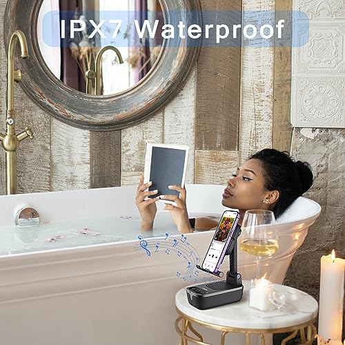 【 IPX7 WATERPROOF SHOWER SPEAKER & RUGGED DESIGN 】 Being IPX7 waterproof, this wireless Bluetooth Cell Phone Stand Speaker is protected against rain, spills, and splashes and can even survive submersion in up to 3.3 feet of water for up to 30 minutes. Perfect for using in home, bathroom, office, gym, etc.